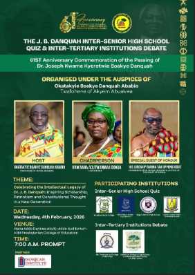 The Twafohene of Akyem Abuakwa, Okatakyie Boakye Danquah Ababio, has announced the institution of a national J. B. Danquah Quiz and Debate Competition, as part of activities marking the 61st anniversary of the death of Ghanaian statesman, scholar, and constitutional thinker Dr Joseph Boakye Danquah.