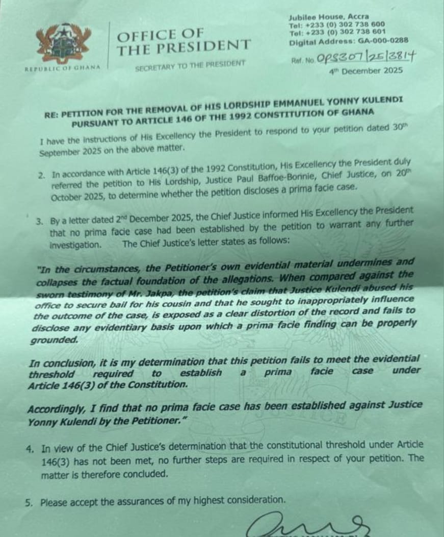President John Dramani Mahama, on the advice of the Chief Justice of the Republic, Justice Paul Baffoe-Bonnie, has dismissed a petition submitted to him seeking the removal of Justice Yonny Kulendi from office as a Justice of the Supreme Court.