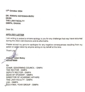 “I am writing to extend a sincere apology to you (Dr Kwaku Agyeman-Budu) for any challenge that may have occurred during the 2022 LSA elections and its aftermaths. Please accept my genuine apologies for any negative consequences resulting from my action or action taken by anyone acting on my behalf at the time,” Festus Tettey Martey’s letter addressed to the Dean of the GIMPA Law School dated 17 October 2024 read.