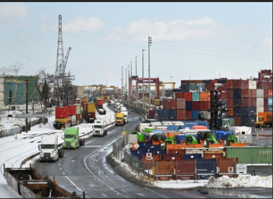 Trucks and shipping containers at the Port of Montreal in Montreal, Quebec, on January 22, 2026. Canada is scheduled to release gross domestic product (GDP) figures on January 30